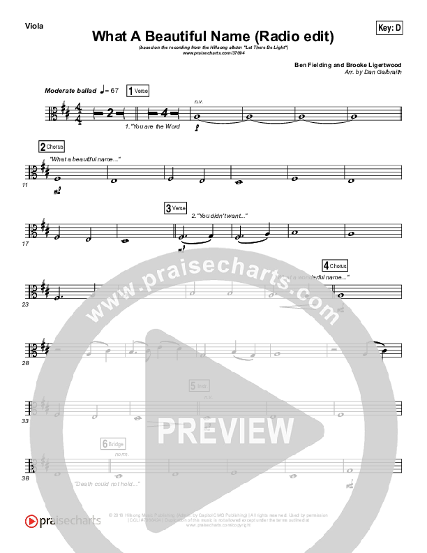 Download the Viola sheet music for What A Beautiful Name (Radio) by Hillsong Worship, from the album Let There Be Light. This song was arranged by Daniel Galbraith in the key of D, E, Eb, Gb.