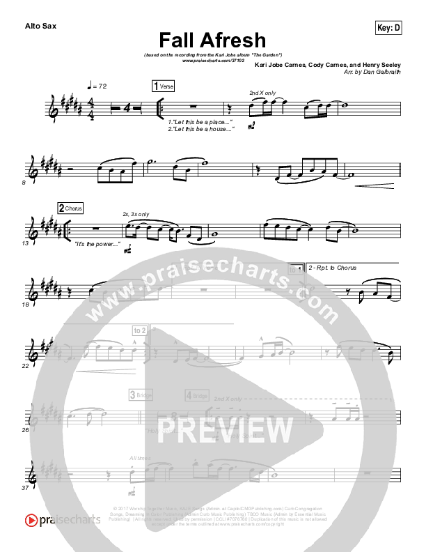Download the AltoSax sheet music for Fall Afresh by Kari Jobe, from the album The Garden. This song was arranged by Daniel Galbraith in the key of D, Eb.