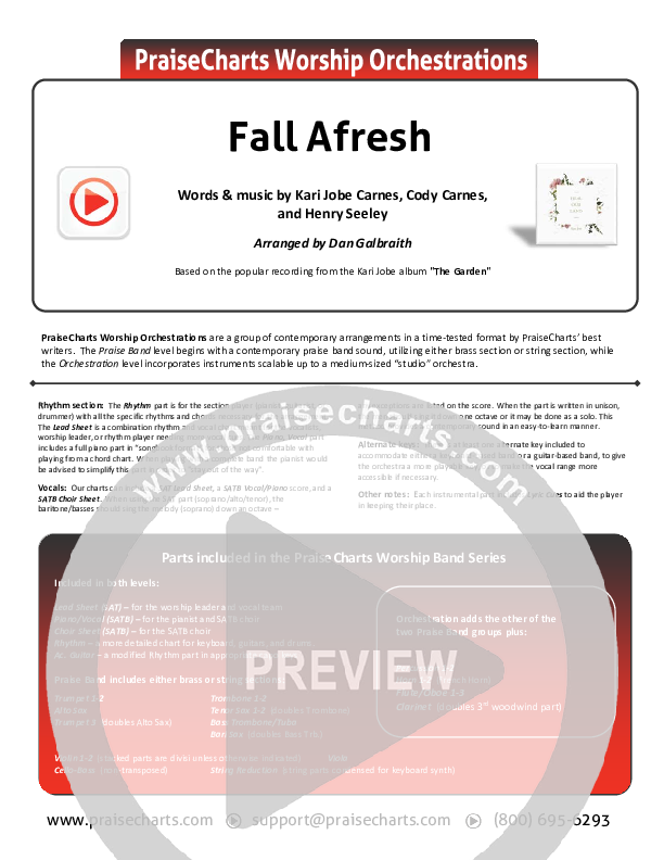 Download the Orchestration for Fall Afresh by Kari Jobe, from the album The Garden. This song was arranged by Daniel Galbraith in the key of D, Eb.