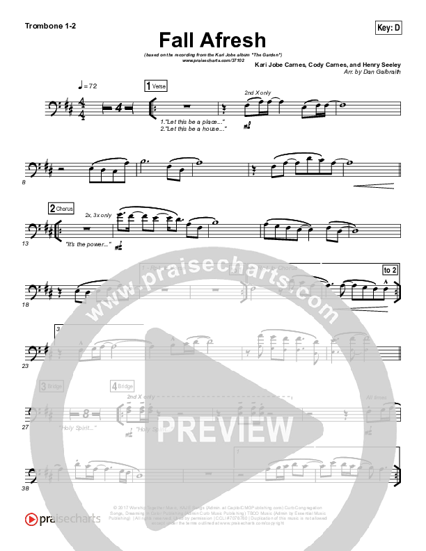 Download the Trombone 1,2 sheet music for Fall Afresh by Kari Jobe, from the album The Garden. This song was arranged by Daniel Galbraith in the key of D, Eb.
