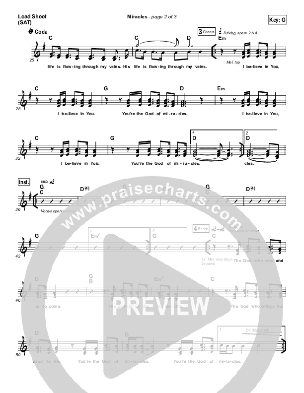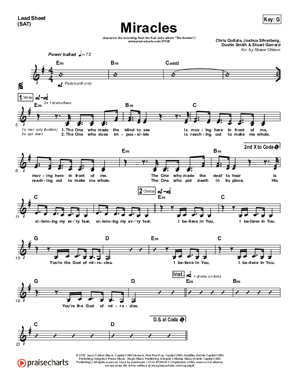 Download the sheet music for Miracles by Kari Jobe, from the album The Garden. This song was arranged by Shane Ohlson in the key of F, G.