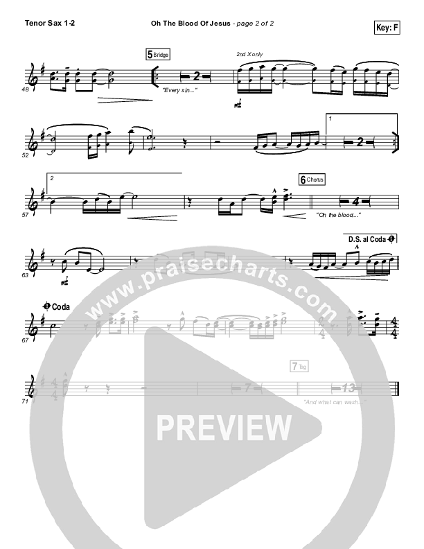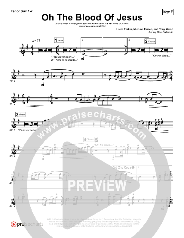 Download the Tenor Sax sheet music for Oh The Blood Of Jesus by Lucia Parker, from the album Oh The Blood Of Jesus. This song was arranged by Daniel Galbraith in the key of F, G.