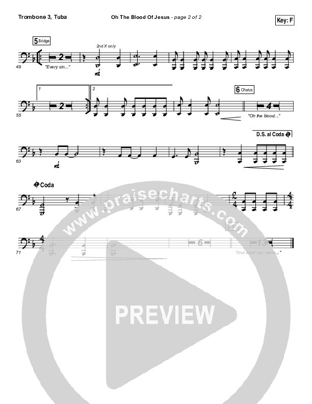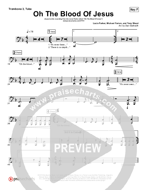 Download the Trombone 3/Tuba sheet music for Oh The Blood Of Jesus by Lucia Parker, from the album Oh The Blood Of Jesus. This song was arranged by Daniel Galbraith in the key of F, G.