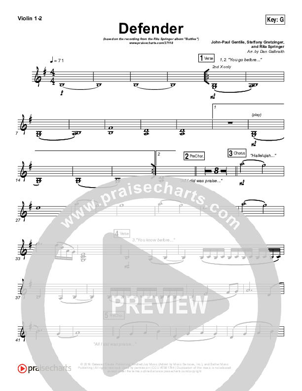 Download the Violin sheet music for Defender by Rita Springer, from the album Battles. This song was arranged by Daniel Galbraith in the key of Ab, G.
