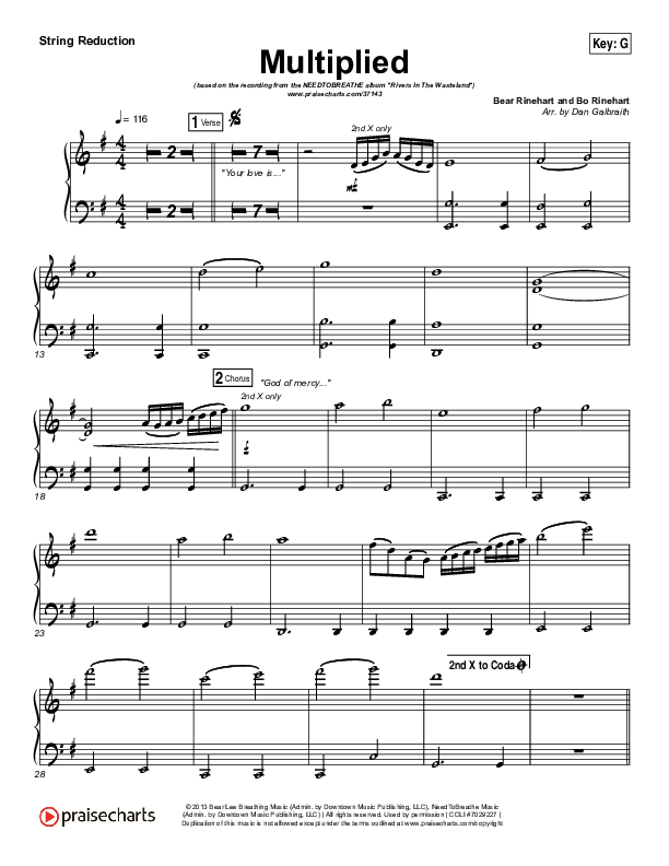 Download the Orchestration for Multiplied by Needtobreathe, from the album Rivers In The Wasteland. This song was arranged by Daniel Galbraith in the key of F, G.