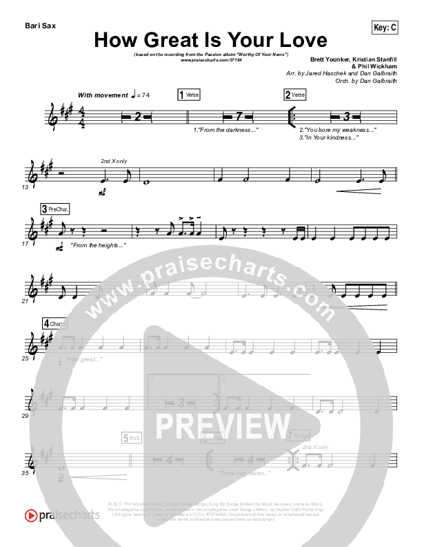 Download the Bari Sax sheet music for How Great Is Your Love by Passion / Kristian Stanfill, from the album Worthy Of Your Name. This song was arranged by Jared Haschek / Daniel Galbraith in the key of B, Bb, C.