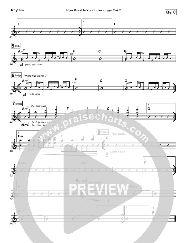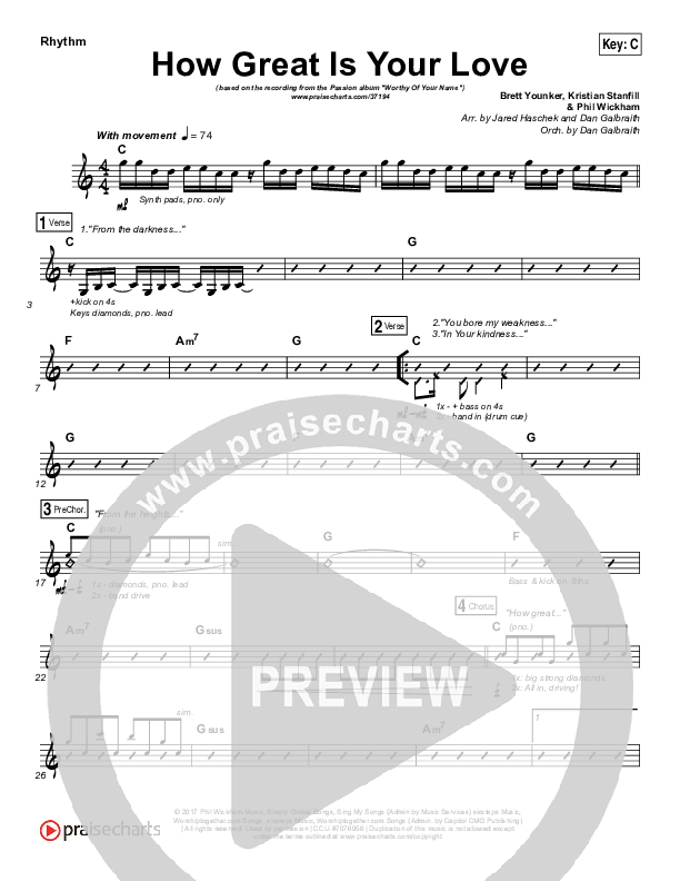 Download the Rhythm Chart for How Great Is Your Love by Passion / Kristian Stanfill, from the album Worthy Of Your Name. This song was arranged by Jared Haschek / Daniel Galbraith in the key of B, Bb, C.