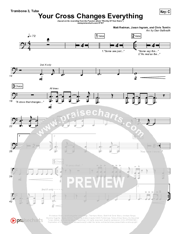 Download the Trombone 3/Tuba sheet music for Your Cross Changes Everything by Passion / Matt Redman, from the album Worthy Of Your Name. This song was arranged by Daniel Galbraith in the key of Bb, C.