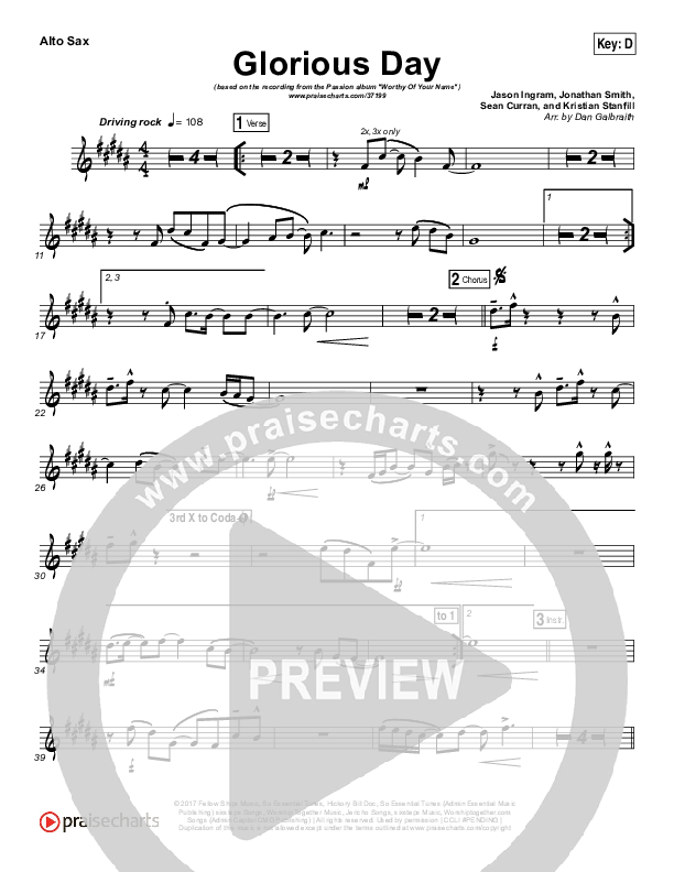 Download the AltoSax sheet music for Glorious Day by Passion / Kristian Stanfill, from the album Worthy Of Your Name. This song was arranged by Daniel Galbraith in the key of A, B, Bb, C, D, E, G.