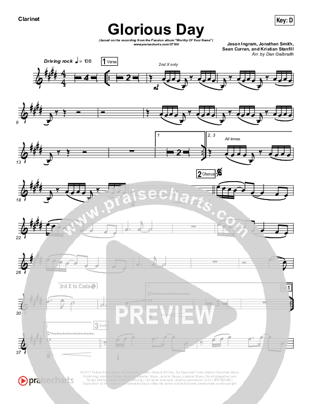 Download the Clarinet sheet music for Glorious Day by Passion / Kristian Stanfill, from the album Worthy Of Your Name. This song was arranged by Daniel Galbraith in the key of A, B, Bb, C, D, E, G.
