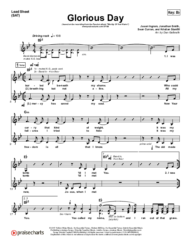 Download the sheet music for Glorious Day by Passion / Kristian Stanfill, from the album Worthy Of Your Name. This song was arranged by Daniel Galbraith in the key of A, B, Bb, C, D, E, G.