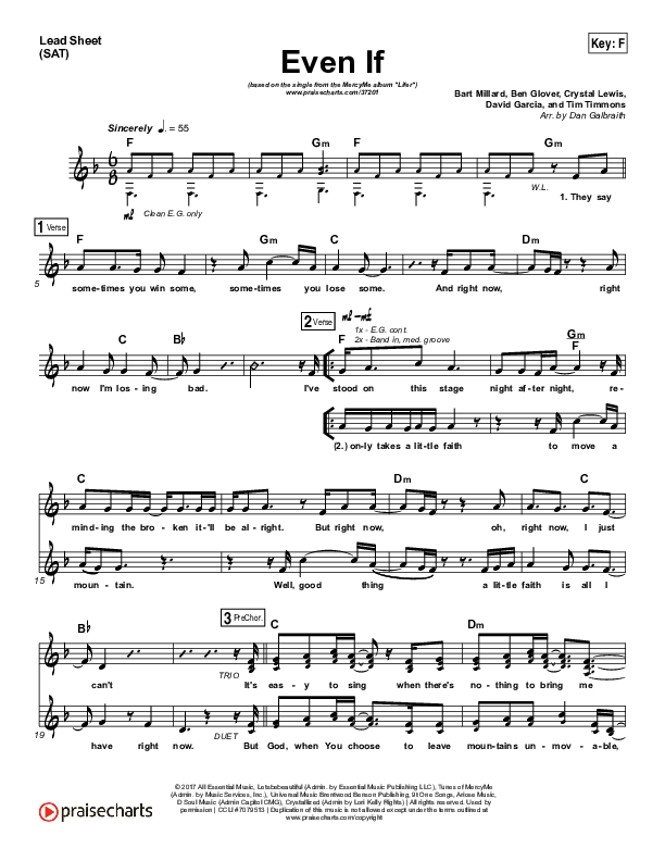 Download the sheet music for Even If by MercyMe, from the album Lifer. This song was arranged by Daniel Galbraith in the key of E, Eb, F.