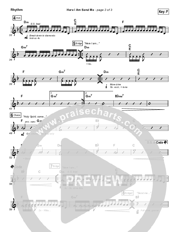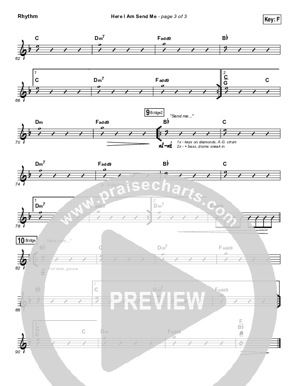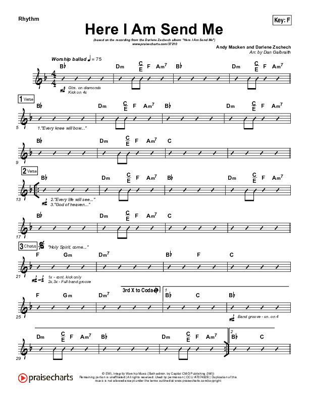 Download the Rhythm Chart for Here I Am Send Me by Darlene Zschech, from the album Here I Am Send Me. This song was arranged by Daniel Galbraith in the key of E, F.