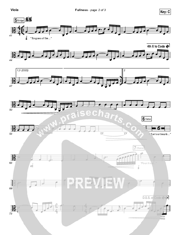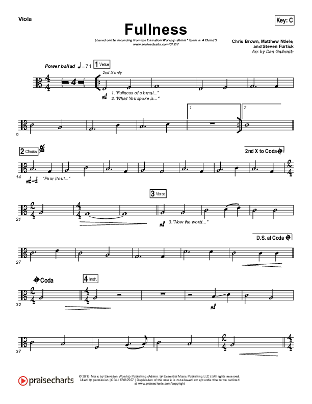 Download the Viola sheet music for Fullness by Elevation Worship, from the album There Is A Cloud. This song was arranged by Daniel Galbraith in the key of Bb, C.