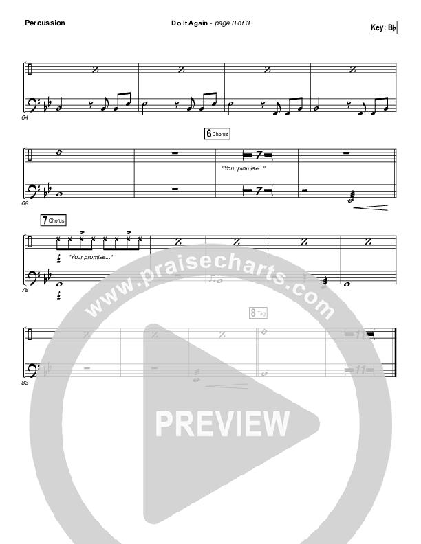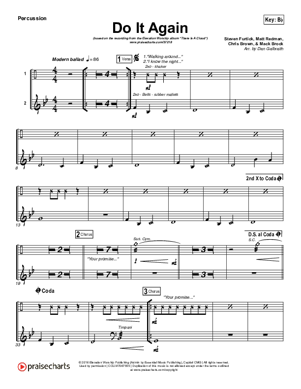 Download the percussion sheet music for Do It Again by Elevation Worship, from the album There Is A Cloud. This song was arranged by Daniel Galbraith in the key of A, Ab, Bb, F, G.