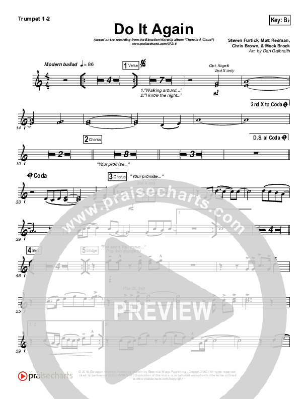 Download the trumpet sheet music for Do It Again by Elevation Worship, from the album There Is A Cloud. This song was arranged by Daniel Galbraith in the key of A, Ab, Bb, F, G.