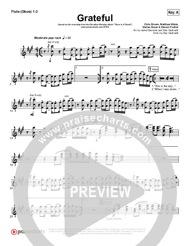 Download the Flute/Oboe sheet music for Grateful by Elevation Worship, from the album There Is A Cloud. This song was arranged by Jared Haschek / Daniel Galbraith in the key of A, C, G.