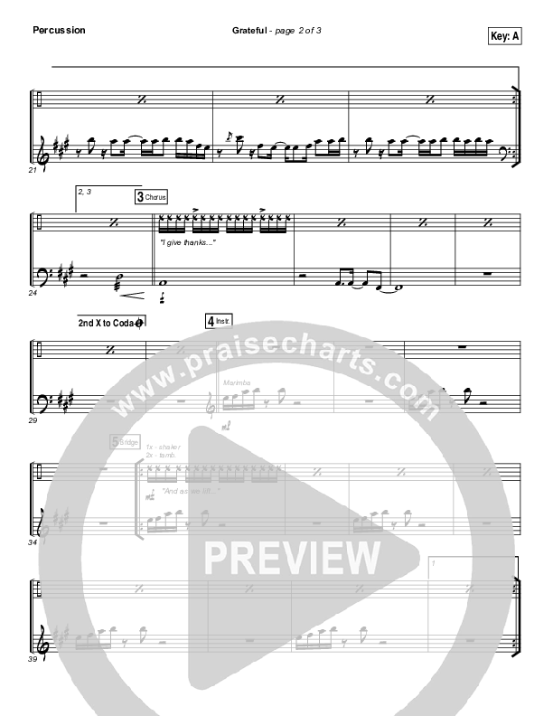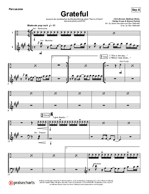 Download the percussion sheet music for Grateful by Elevation Worship, from the album There Is A Cloud. This song was arranged by Jared Haschek / Daniel Galbraith in the key of A, C, G.