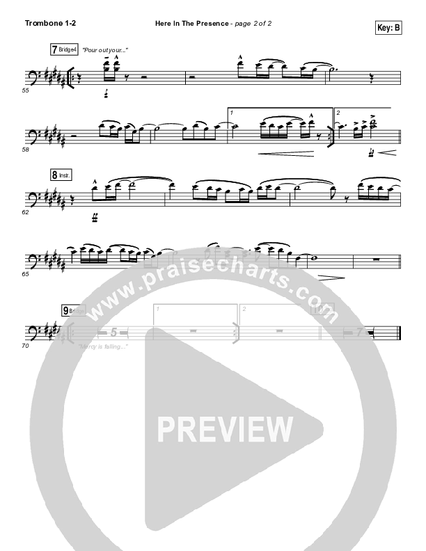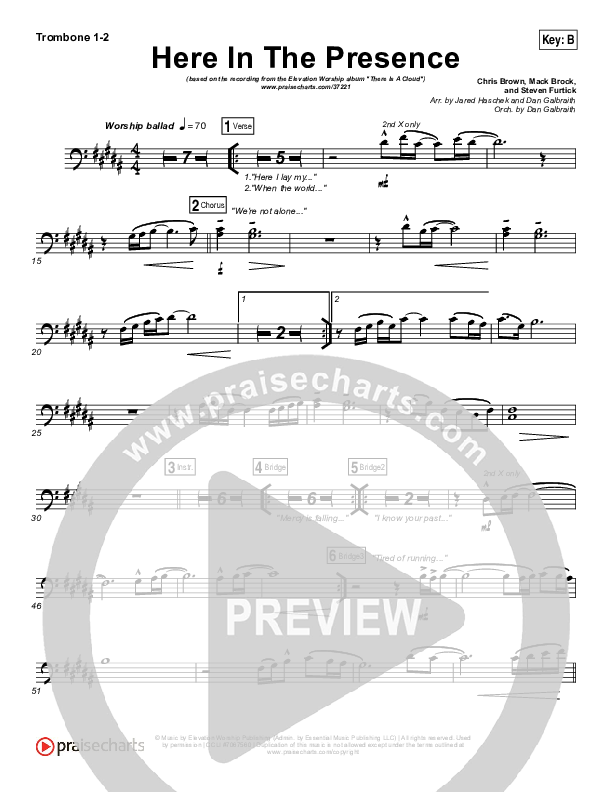 Download the Trombone 1,2 sheet music for Here In The Presence by Elevation Worship, from the album There Is A Cloud. This song was arranged by Jared Haschek / Daniel Galbraith in the key of B, Bb.