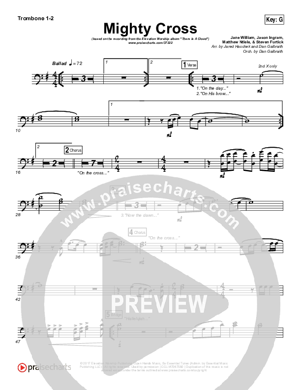 Download the Trombone 1,2 sheet music for Mighty Cross by Elevation Worship, from the album There Is A Cloud. This song was arranged by Jared Haschek / Daniel Galbraith in the key of A, Ab, G.