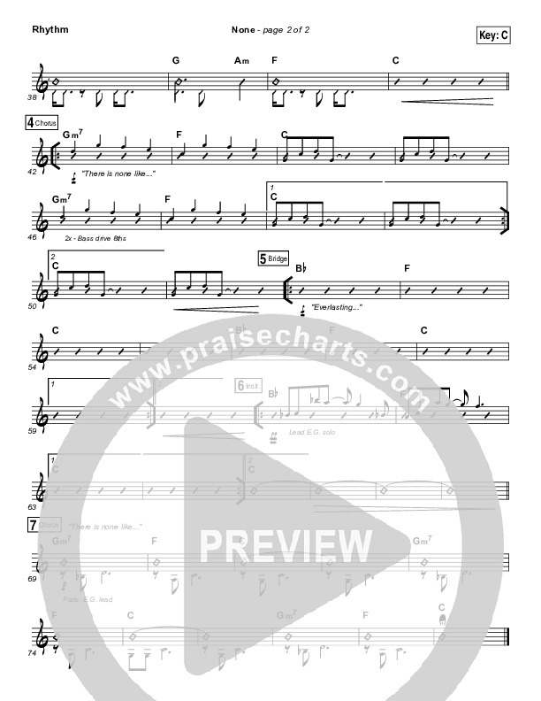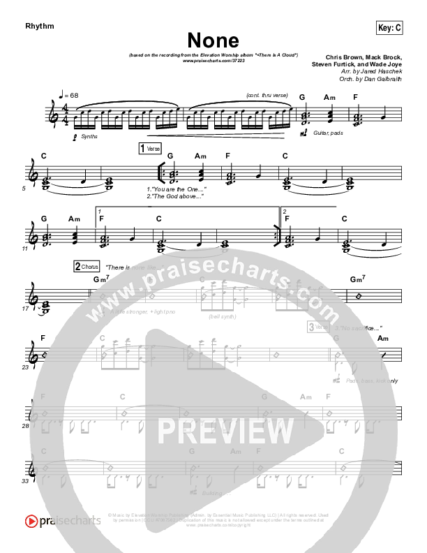 Download the Rhythm Chart for None by Elevation Worship, from the album There Is A Cloud. This song was arranged by Jared Haschek / Daniel Galbraith in the key of Bb, C.