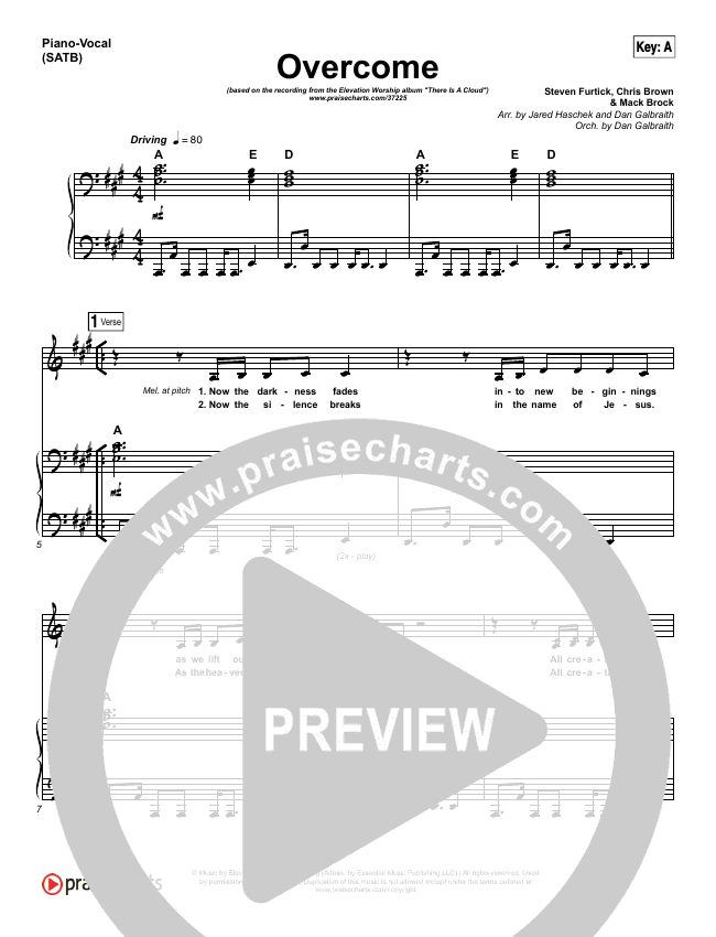 Download the Orchestration for Overcome by Elevation Worship, from the album There Is A Cloud. This song was arranged by Jared Haschek / Daniel Galbraith in the key of A, F, G.