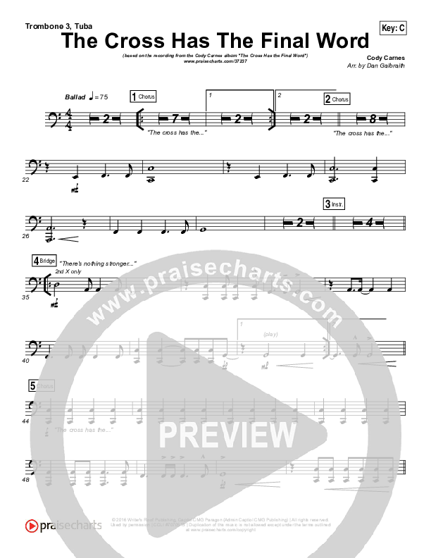 Download the Trombone 3/Tuba sheet music for The Cross Has The Final Word by Cody Carnes, from the album The Cross Has The FInal Word. This song was arranged by Daniel Galbraith in the key of B, C, D.