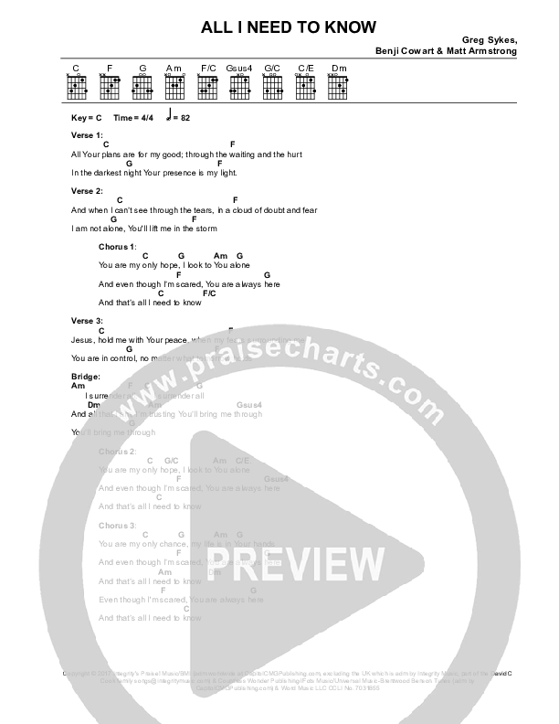 Download the PDF Chord Charts for All I Need To Know by Greg Sykes, from the album Reverse. This song was arranged by Integrity Music in the key of C.