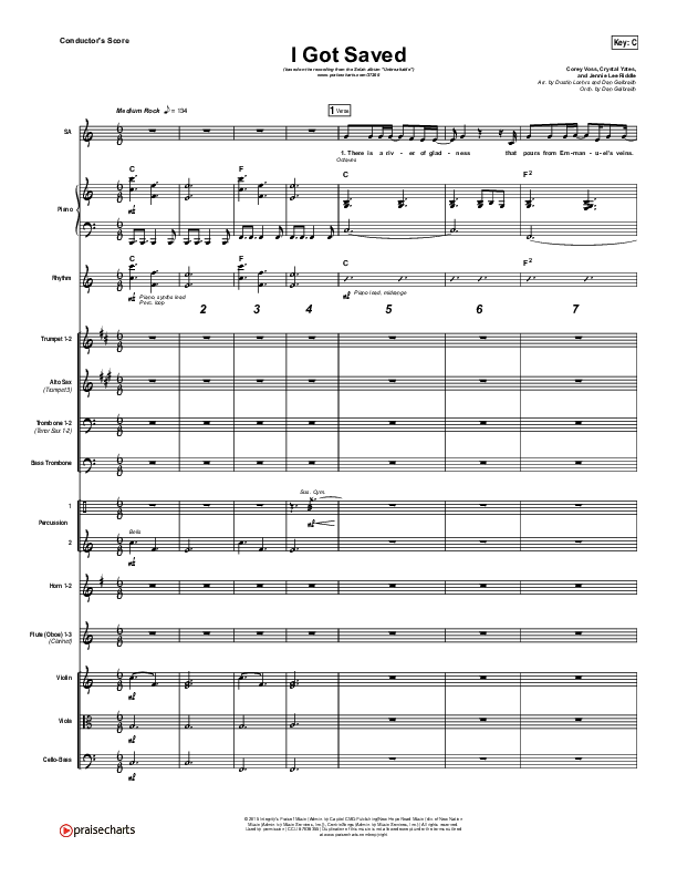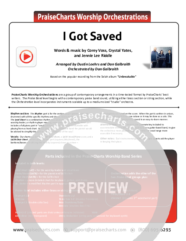 Download the Orchestration for I Got Saved by Selah, from the album Unbreakable. This song was arranged by Dustin Loehrs / Daniel Galbraith in the key of Bb, C.