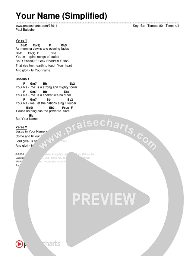 Download the PDF Chord Charts for Your Name (Simplified), from the album Simplified Worship. This song was arranged by PraiseCharts in the key of A, Ab, B, Bb, C, D, Db, E, Eb, F, G, Gb.