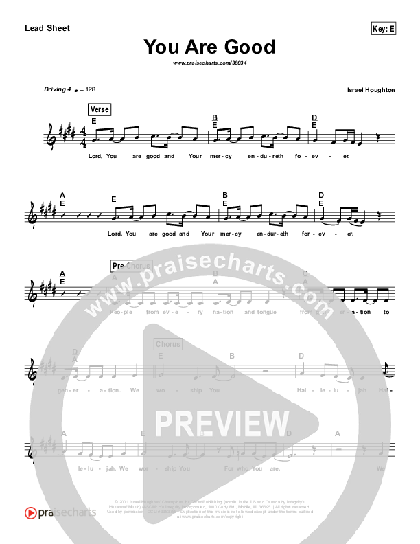 Download the sheet music for You Are Good (Simplified) by Israel Houghton, from the album Simplified Worship. This song was arranged by PraiseCharts in the key of A, Ab, B, Bb, C, D, Db, E, Eb, F, G, Gb.