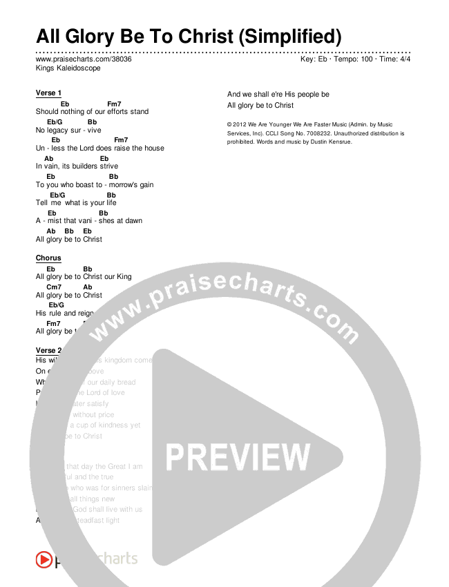 Download the PDF Chord Charts for All Glory Be To Christ (Simplified) by Dustin Kensrue, from the album Simplified Worship. This song was arranged by PraiseCharts in the key of A,Ab,B,Bb,C,D,Db,E,Eb,F,G,Gb.