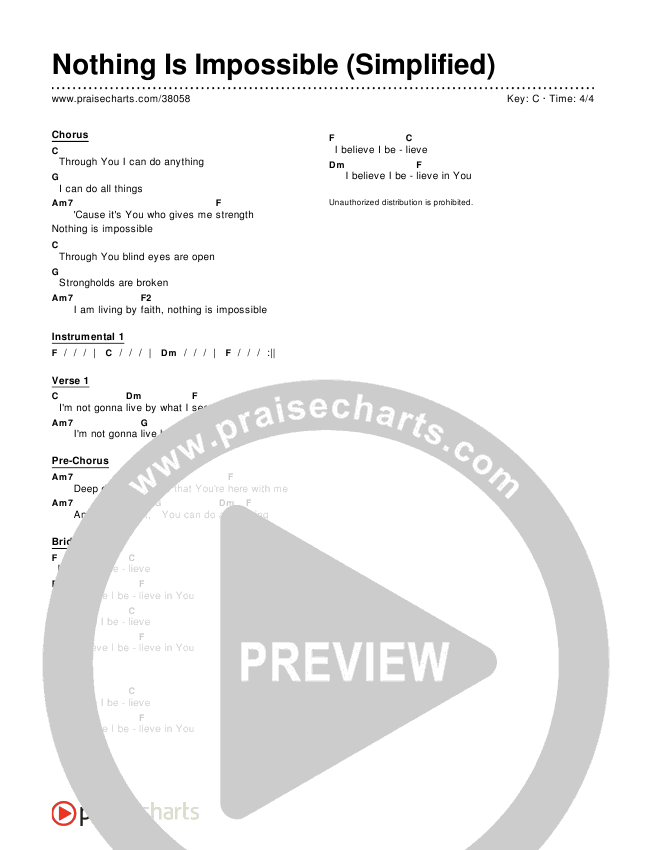Download the PDF Chord Charts for Nothing Is Impossible (Simplified), from the album Simplified Worship. This song was arranged by PraiseCharts in the key of A, Ab, B, Bb, C, D, Db, E, Eb, F, G, Gb.