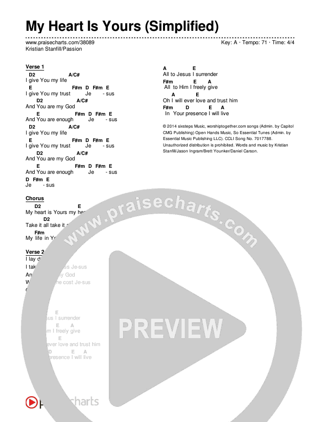 Download the PDF Chord Charts for My Heart Is Yours (Simplified), from the album Simplified Worship. This song was arranged by PraiseCharts in the key of A, Ab, B, Bb, C, D, Db, E, Eb, F, G, Gb.