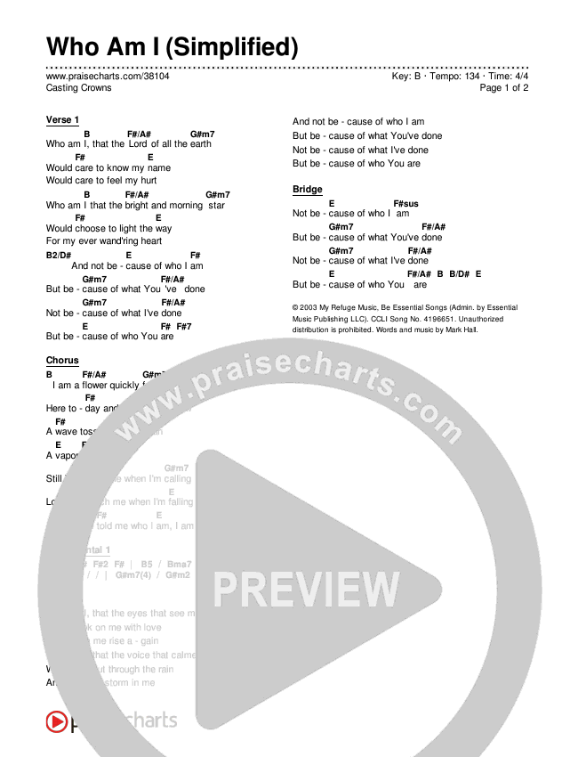 Download the PDF Chord Charts for Who Am I (Simplified), from the album Simplified Worship. This song was arranged by PraiseCharts in the key of A, Ab, B, Bb, C, D, Db, E, Eb, F, G, Gb.