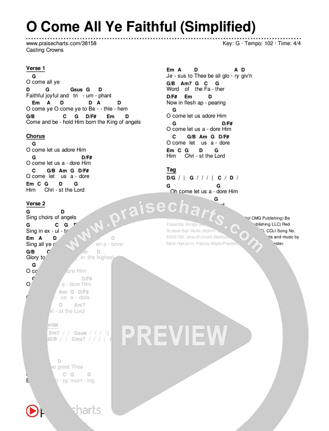 Download the PDF Chord Charts for O Come All Ye Faithful (Simplified) by Casting Crowns, from the album Simplified Worship. This song was arranged by PraiseCharts in the key of A, Ab, B, Bb, C, E, F, G, Gb.