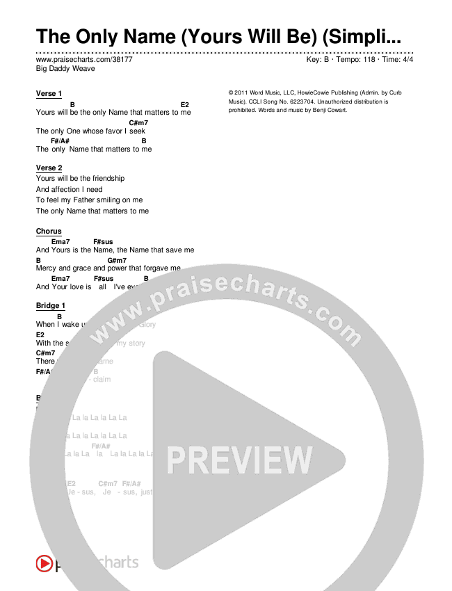 Download the PDF Chord Charts for The Only Name (Yours Will Be) (Simplified), from the album Simplified Worship. This song was arranged by PraiseCharts in the key of B, C.