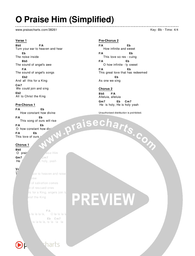 Download the PDF Chord Charts for O Praise Him (Simplified), from the album Simplified Worship. This song was arranged by PraiseCharts in the key of A,Ab,B,Bb,C,D,Db,E,Eb,F,G,Gb.