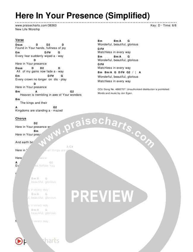 Download the PDF Chord Charts for Here In Your Presence (Simplified), from the album Simplified Worship. This song was arranged by PraiseCharts in the key of A,Ab,B,Bb,C,D,Db,E,Eb,F,G,Gb.