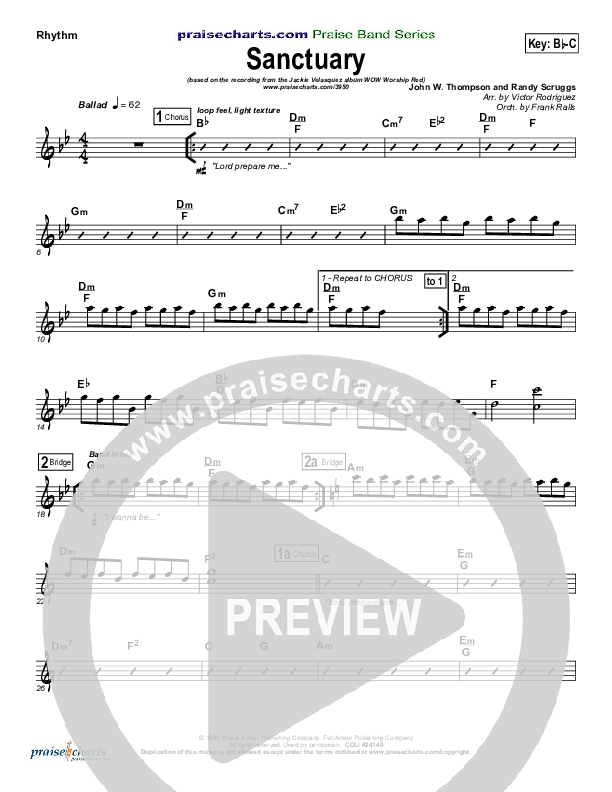 Download the Rhythm Chart for Sanctuary by Jaci Velasquez, from the album WOW Worship Red. This song was arranged by Frank Ralls / Victor Rodriguez in the key of Bb, C.