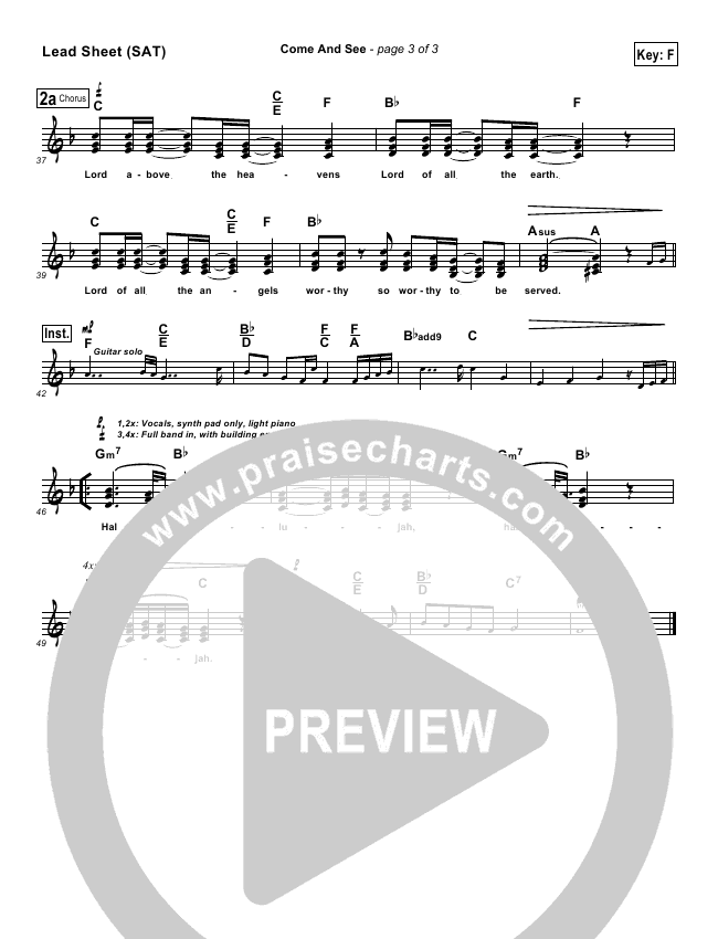 Download the sheet music for Come And See by Maranatha Praise Band, from the album Live Worship With Bob Fitts. This song was arranged by Kevin Eng in the key of F.