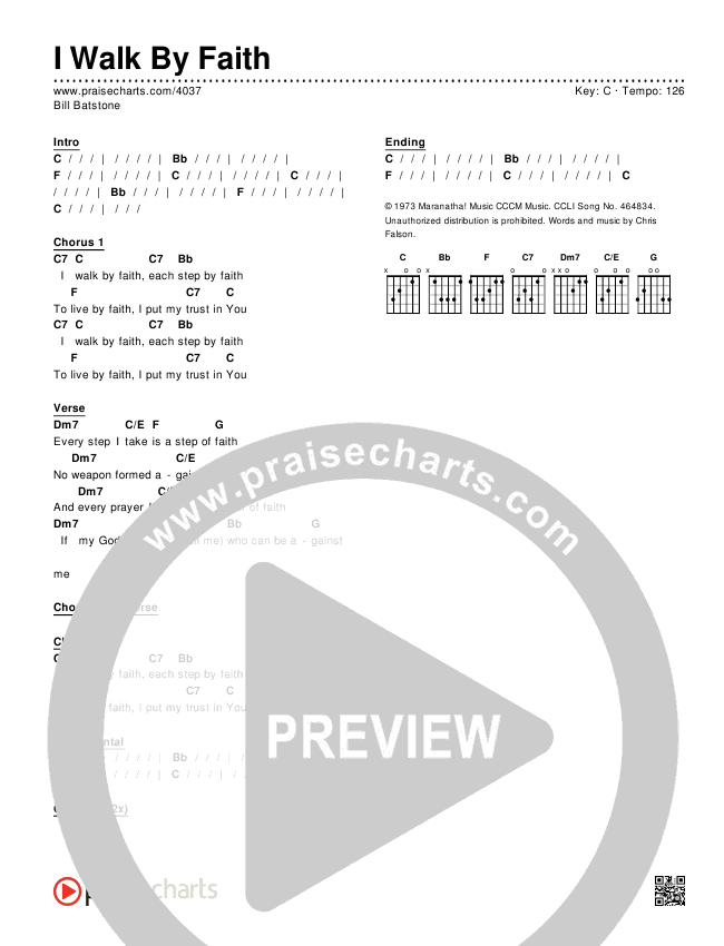 Download the PDF Chord Charts for I Walk By Faith by Bill Batstone, from the album Scripture Songs - Restore Us O God. This song was arranged by Kevin Eng in the key of B, C.