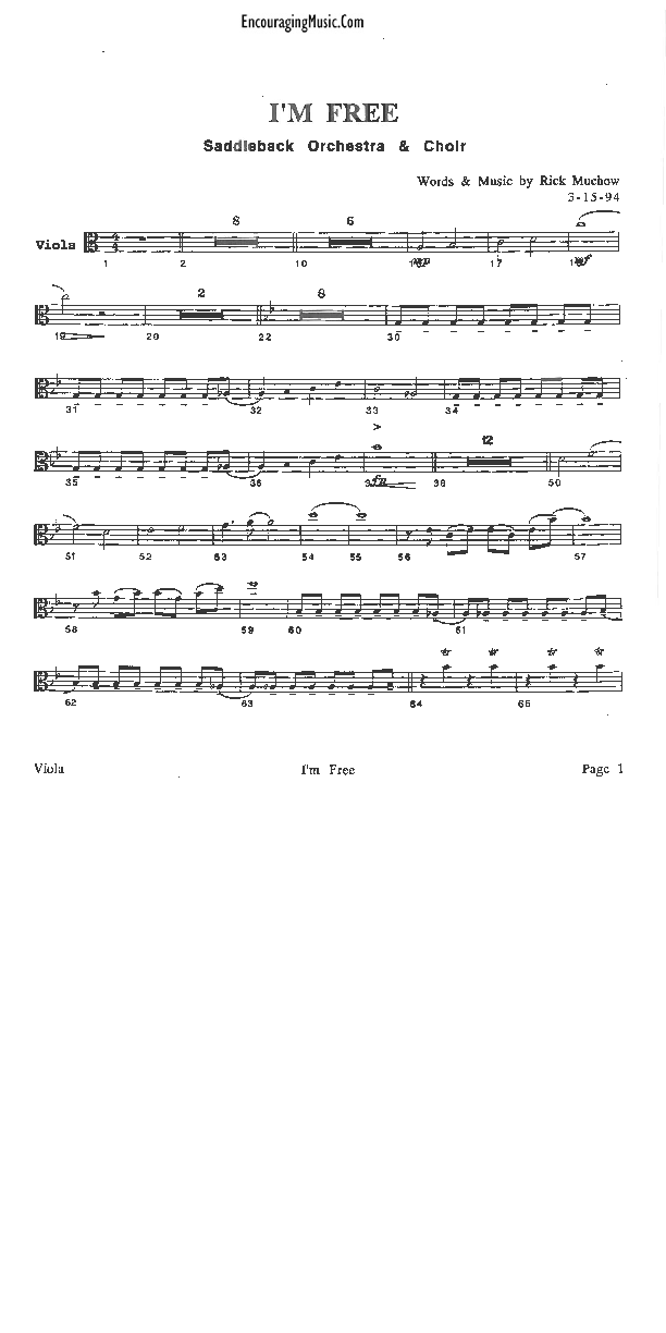 Download the Viola sheet music for I'm Free by Rick Muchow, from the album Home. This song was arranged by Encouraging Music in the key of C.
