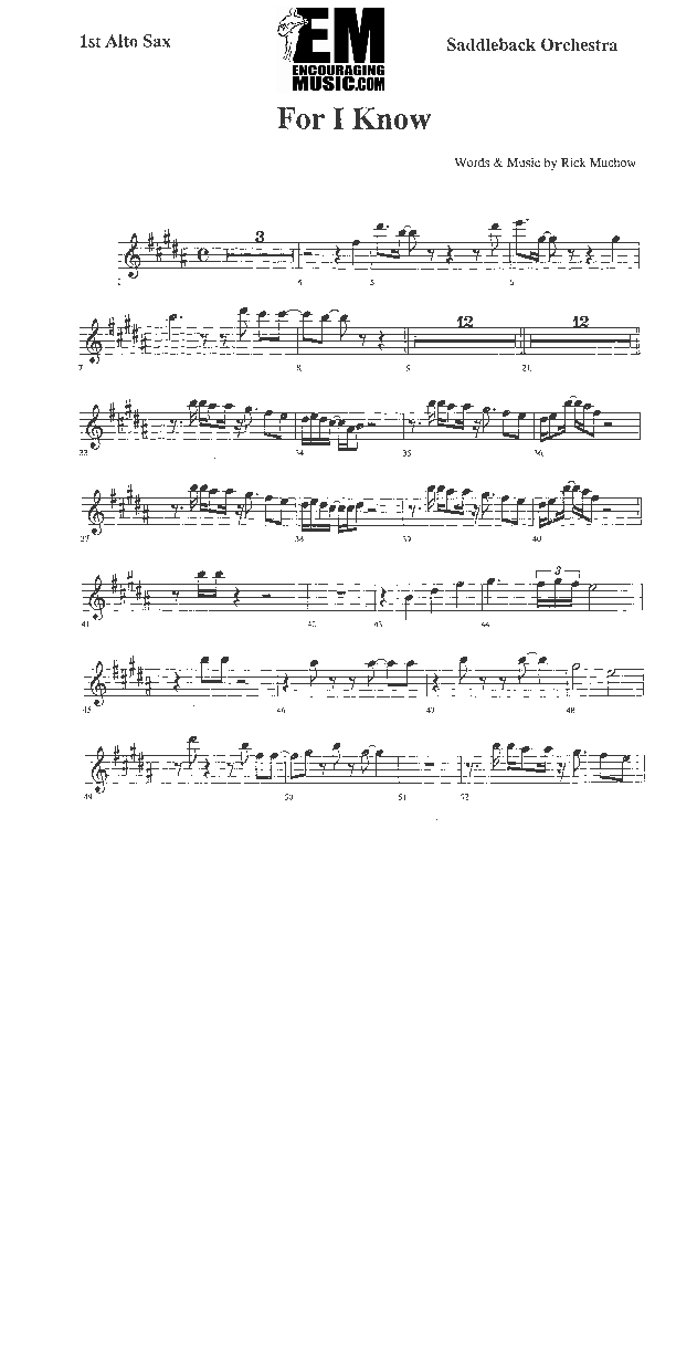 Download the Alto Sax 1,2 sheet music for For I Know by Rick Muchow, from the album Promises. This song was arranged by Encouraging Music in the key of D.