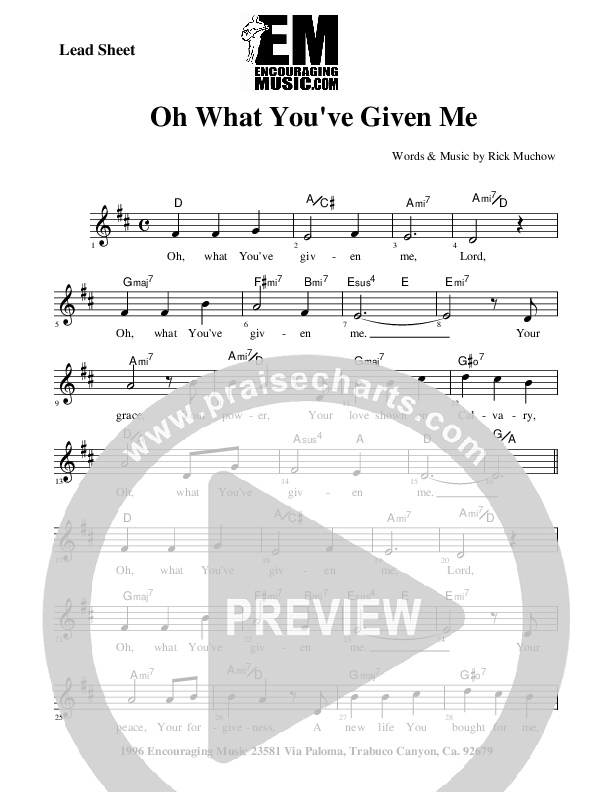Download the Orchestration for Oh What You've Given Me by Rick Muchow, from the album Promises. This song was arranged by Encouraging Music in the key of D.