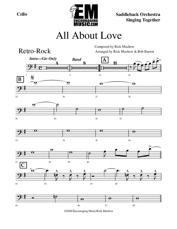 Download the Cello sheet music for All About Love by Rick Muchow, from the album All About Love. This song was arranged by Encouraging Music in the key of G.