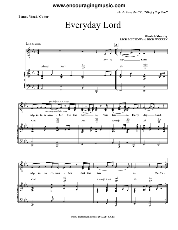 Download the sheet music for Everyday by Rick Muchow, from the album Rick Muchow's Top 10. This song was arranged by Encouraging Music in the key of Eb.