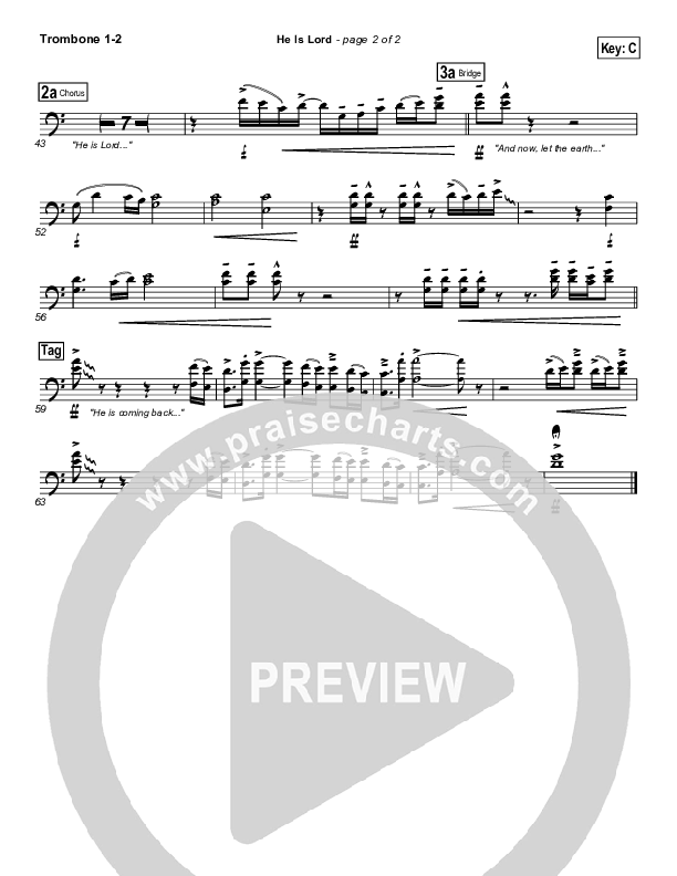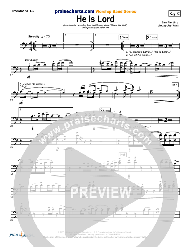 Download the Trombone 1,2 sheet music for He is Lord by Hillsong Worship, from the album This Is Our God. This song was arranged by Joel Mott in the key of C, D.