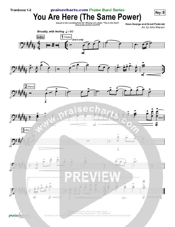 Download the Trombone 1,2 sheet music for You Are Here (The Same Power) by Hillsong Worship, from the album This Is Our God. This song was arranged by John Wasson in the key of B, Bb.