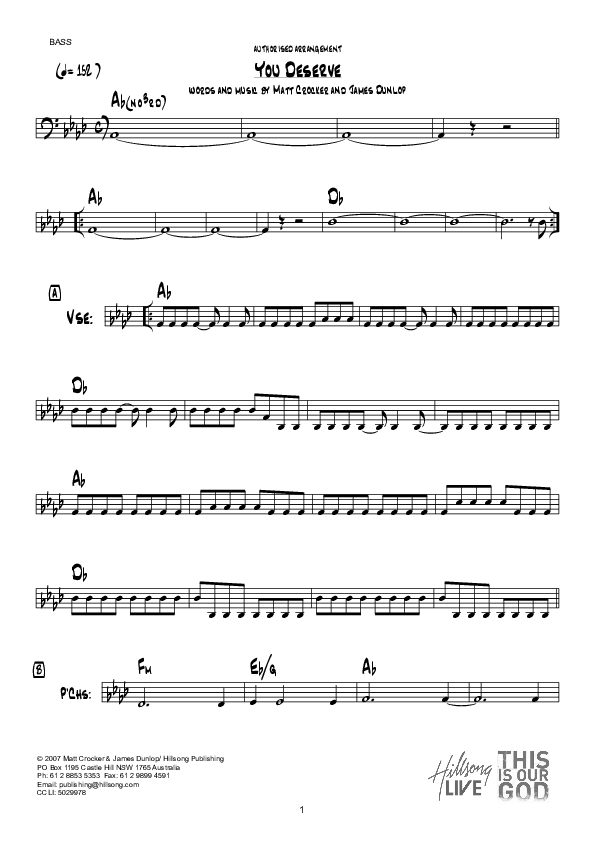 Download the Bass Guitar parts for You Deserve (Instrumental) by Hillsong Worship, from the album This Is Our God. This song was arranged by Hillsong Music in the key of Ab.